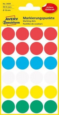 Etikett, 18 mm, kör, AVERY ZWECKFORM, 5 különböző szín, 96 etikett/csomag